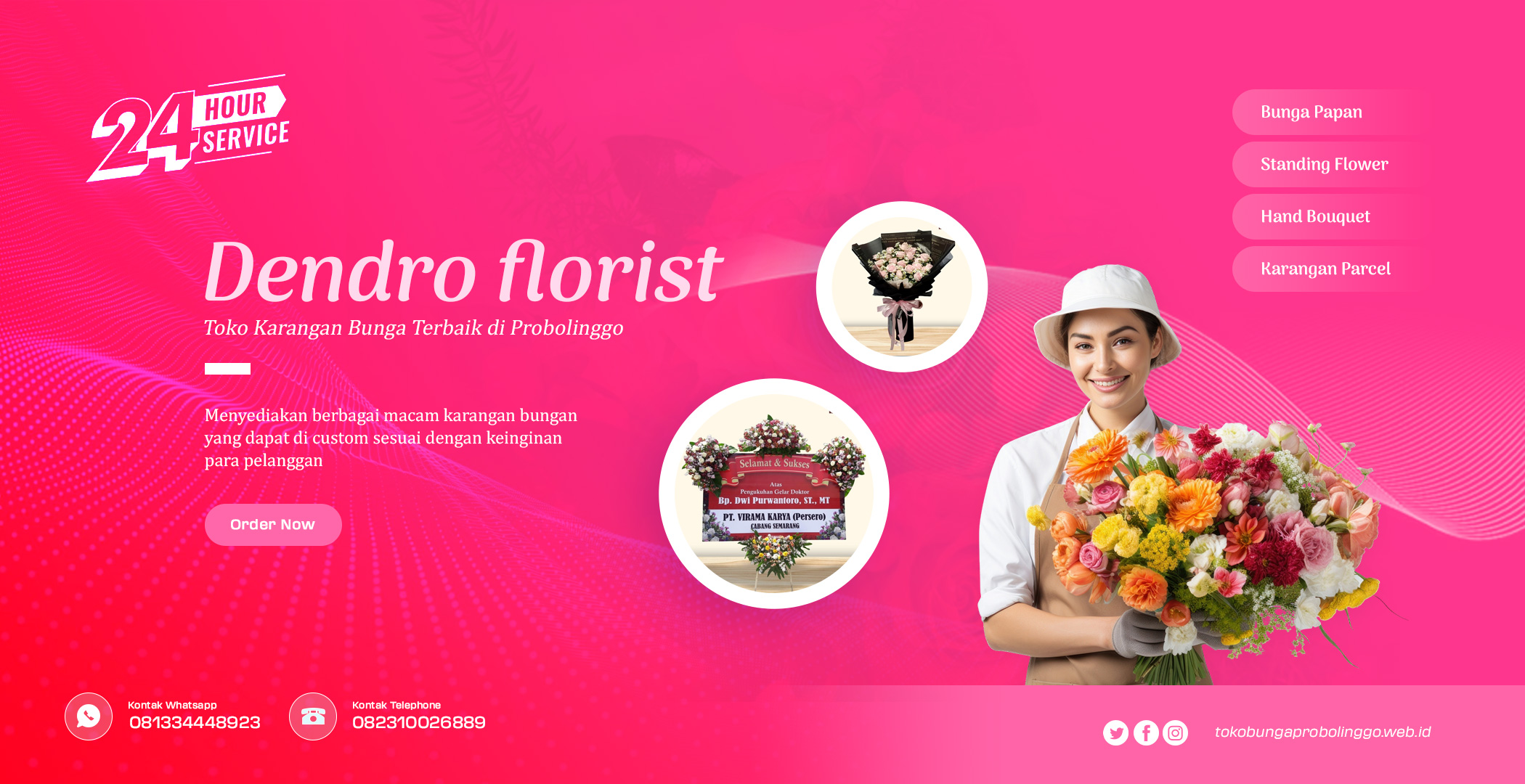 Dendro Florist Probolinggo adalah toko bunga terpercaya yang melayani berbagai kebutuhan rangkaian bunga seperti bunga papan ucapan, hand bouquet, standing flower, dan dekorasi bunga lainnya. Dendro Florist melayani pengiriman gratis ke wilayah Probolinggo, Pasuruan, Nguling, Paiton, hingga Bondowoso, menjadikan kami pilihan utama masyarakat untuk kebutuhan florist lokal maupun online.